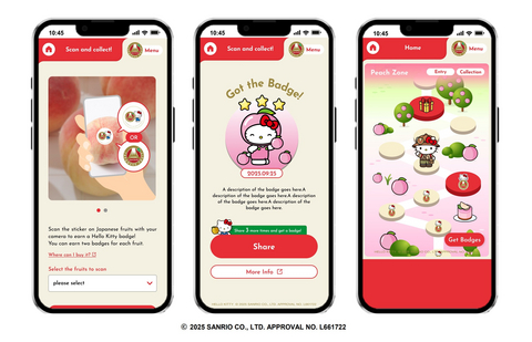 The Japan Fruit and Vegetables Export Promotion Council (J-FEC) is once again teaming up with Sanrio Co., Ltd. and its character Hello Kitty to launch the interactive digital campaign “Hello Kitty Japanese Fruit Hunt.” Participants use their smartphones to explore a variety of real-world locations—such as restaurants, retail stores, and promotional events—where the official “Japan-Grown Fruit” label2 is displayed. By scanning the label with their smartphone, they collect digital badges and join Hello Kitty on a fun scavenger hunt to discover the freshness and appeal of Japan-grown fruits in a uniquely interactive way.