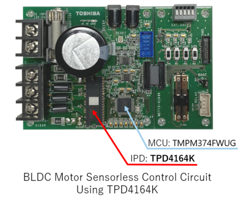 A “Reference Design for Sensorless Brushless DC Motor Drive Circuit” that utilizes the functions of the new TPD4164K with a TMPM374FWUG microcontroller with vector control engine is available from today on Toshiba’s website.